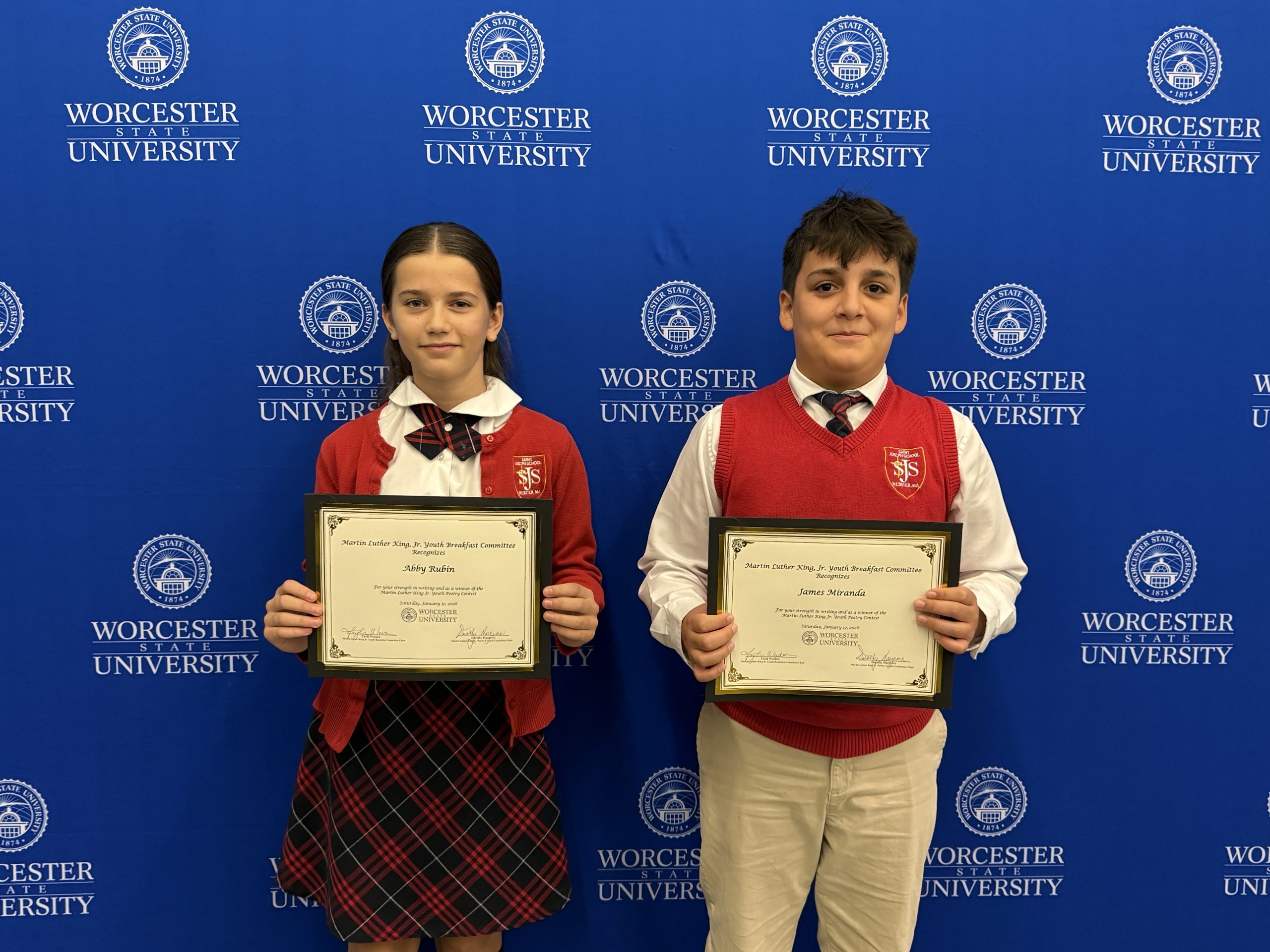 Saint Joseph School is proud to announce that 7th Grade students Abby Rubin and James Miranda were selected as winners in Worcester State University’s 32nd Annual Dr. Martin Luther King, Jr. Celebration Poetry Contest, themed “Voices of the Future: Bold Roots, Brave Leaders.”